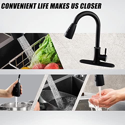 This product is designed for anyone looking to upgrade their kitchen sink faucet. It features a pull-down type design with spray and stream modes, a single handle tap with a 360-degree swivel sprayer and hot and cold water pipeline. It also has a spot-free black finish stainless steel finish.