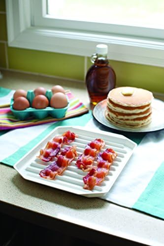 Specially designed microwavable rack keeps bacon elevated so fat drips off. Lid helps contain spatters.